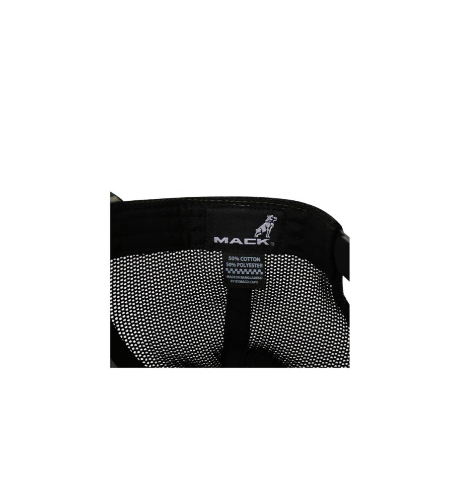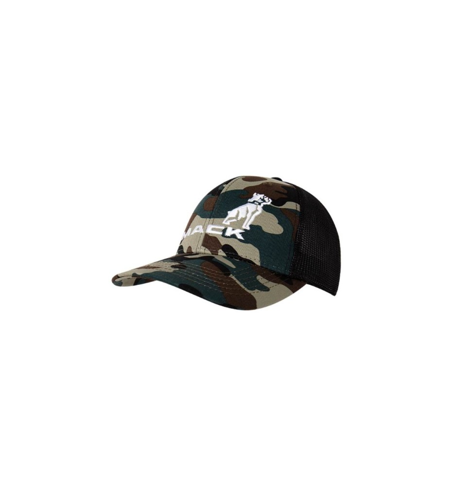 Camo chino 6-panel trucker cap with a snapback closure featuring a white Mack logo embroidery.
