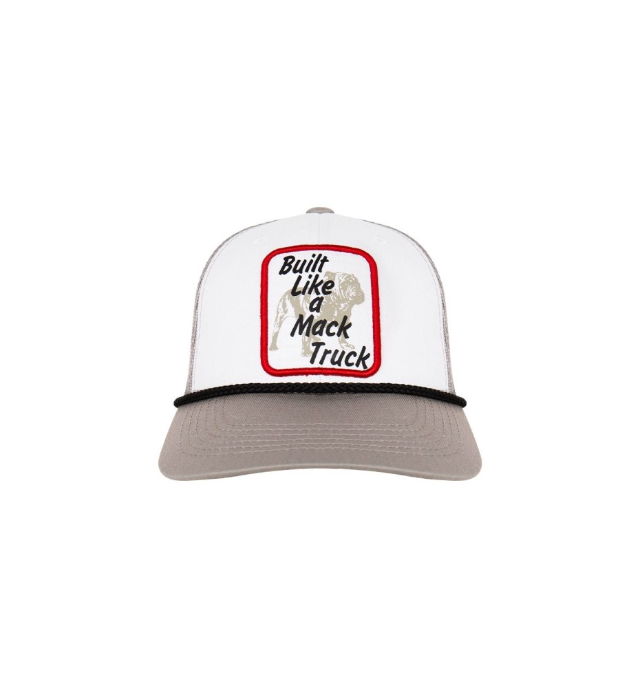 The Mack Built Like A Mack Truck cap is a stylish and vintage-inspired accessory that showcases the iconic retro Mack design. Made with a grey trucker mesh crown and mesh sides and foam back, this cap offers a classic design for any on-the-go attire. Each cap features a Bulldog repeat design under the bill and an adjustable closure to ensure a comfortable fit. Perfect for any Mack fan, this cap is a must-have addition to your Mack pride.