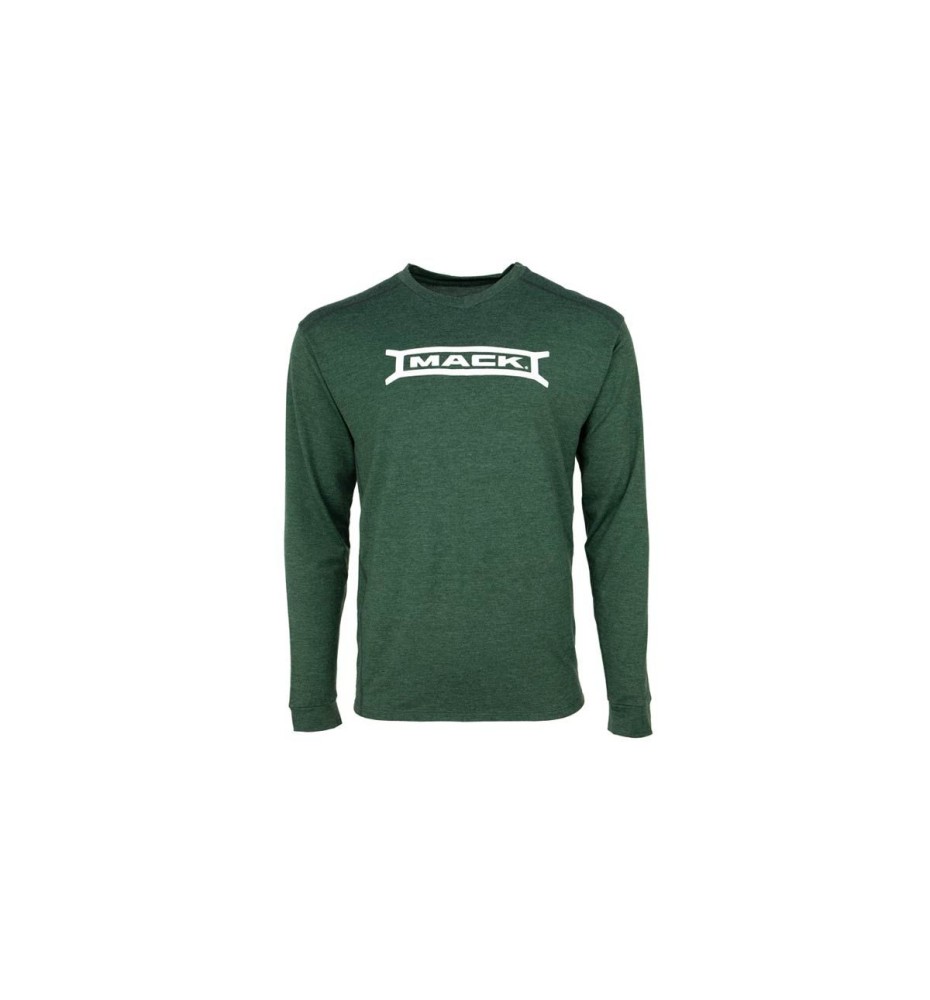 Stay stylish and comfortable with our Mack Bridge Tri-flex Dark Green LS Shirt. Made with our Tri-Flex Collection, this shirt features a sporty heathered look and a touch of spandex stretch. It has long sleeves, contrast stitching, and a pointed crew collar for added style. The active fit blend of polyester, rayon, and spandex ensures a comfortable fit that moves with you. Show off your Mack pride with this high-quality shirt.