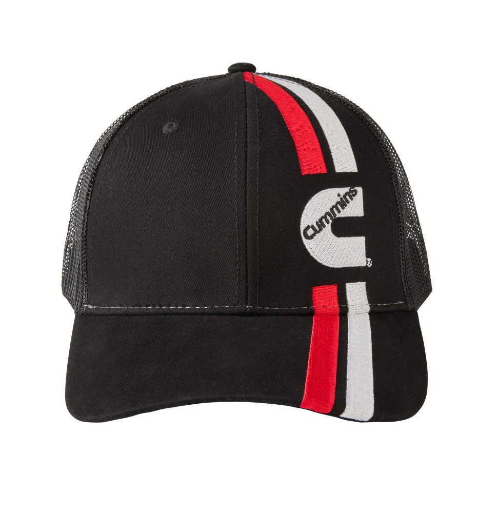 Experience a comfortable fit with the 80 percent cotton and 20 percent poly mesh fabric of this retro racing stripes logo Cummins cap. The soft cotton in this snapback trucker hat feels cozy while the poly mesh ensures breathability making these hats comfortable and practical. The structured shape keeps this diesel hat looking sharp. With its snapback closure this hat can be adjusted for your perfect fit. Whether you like it snug or loose the snap closure ensures a comfortable wearing experience. The interior band wicks away moisture adding comfort during warm days. Interior Cummins-branded seam covering adds an extra touch of style and quality. This baseball hat is going to be a cherished apparel item for men and women with the potential to become notably favored and repetitively warn. Maybe even to the point of your friends saying something about it. You should get one for them too.